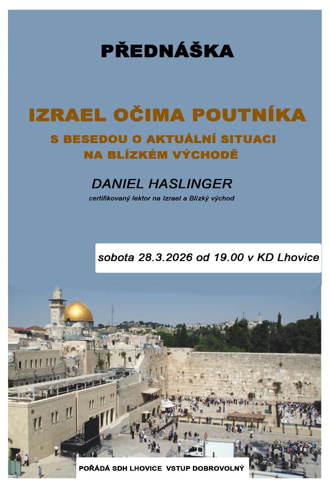 SDH Lhovice Vás zve na přednášku pana Daniela Haslingera pod názvem Izrael očima poutníka, s besedou o aktuální situaci na blízkém východě. V sobotu 28. března 2026 od 19:00 hodin v KD Lhovice. Pan Haslinger je certifikovaný lektor na Izrael a blízký východ. Vstupné dobrovolné